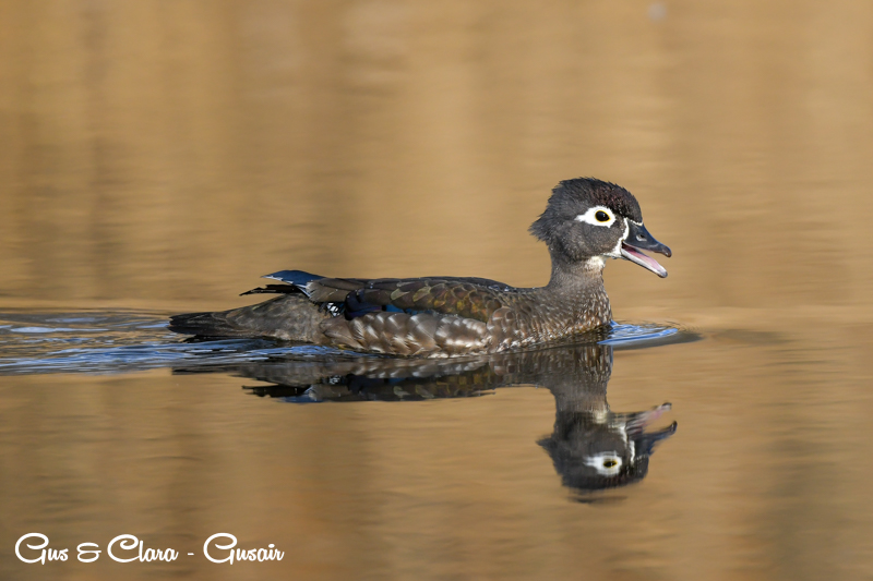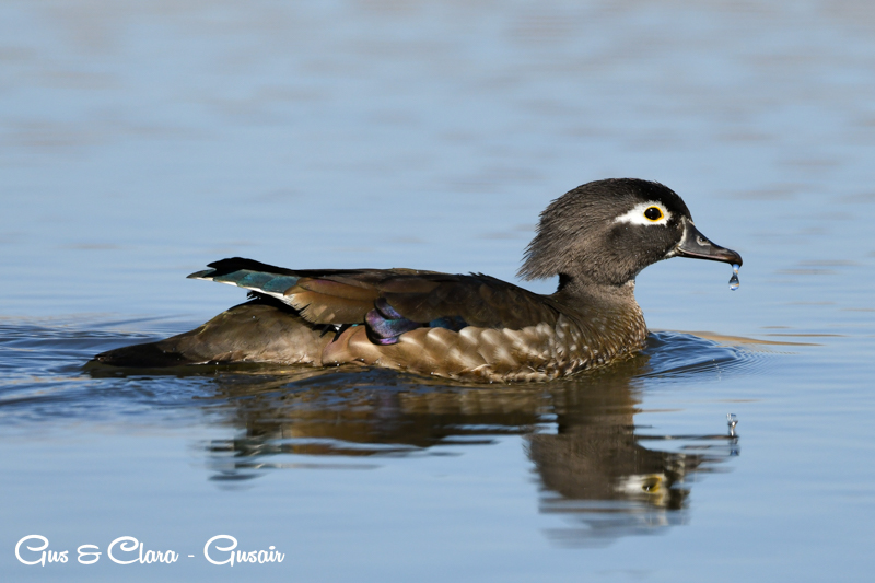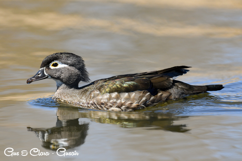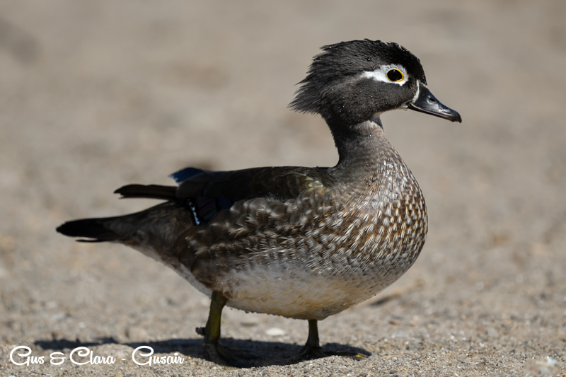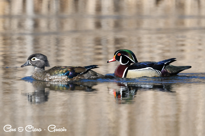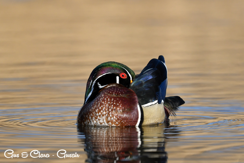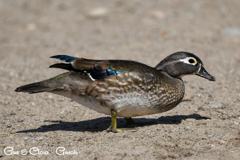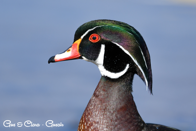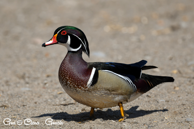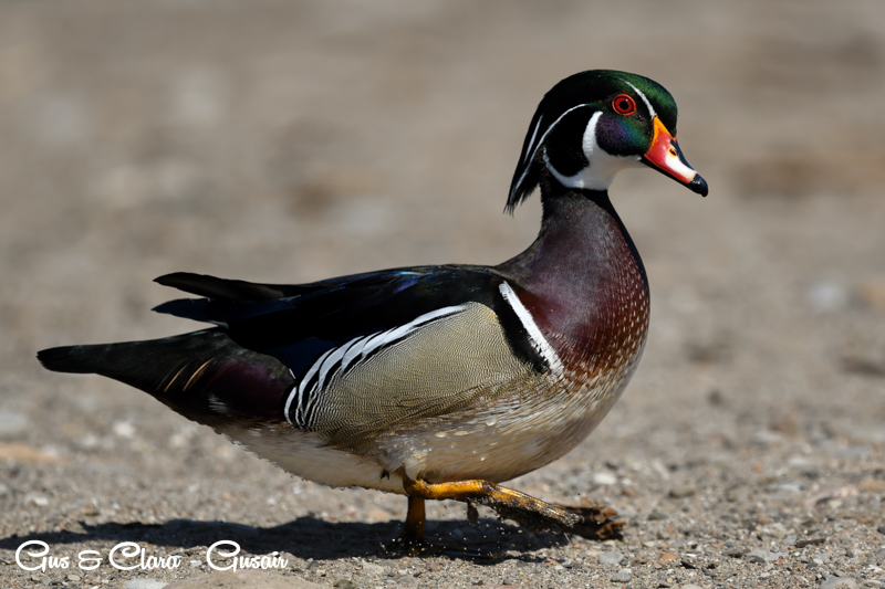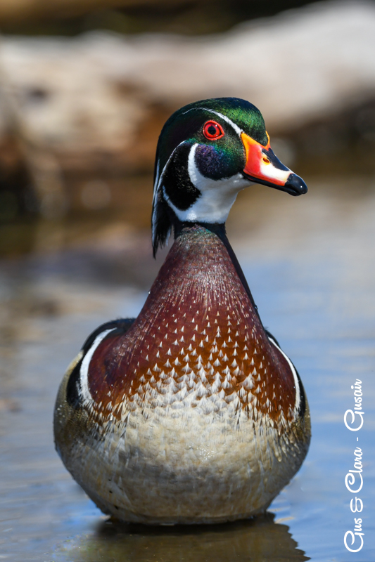 The drake has a distinctive and colorful appearance with a crested head. Its body is adorned with iridescent green, purple, and bronze feathers. The sides are marked with white stripes, and the chest is a rich chestnut color. The female, called the hen, has more muted colors, featuring a grayish-brown body with a white teardrop-shaped eye ring.